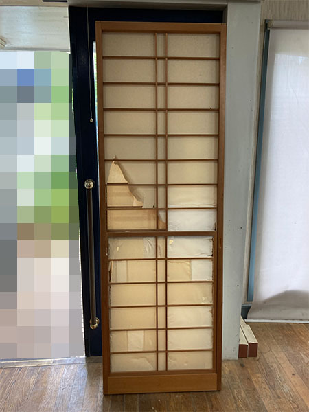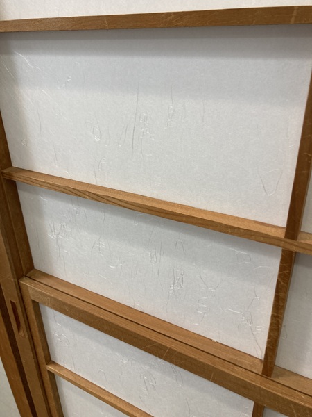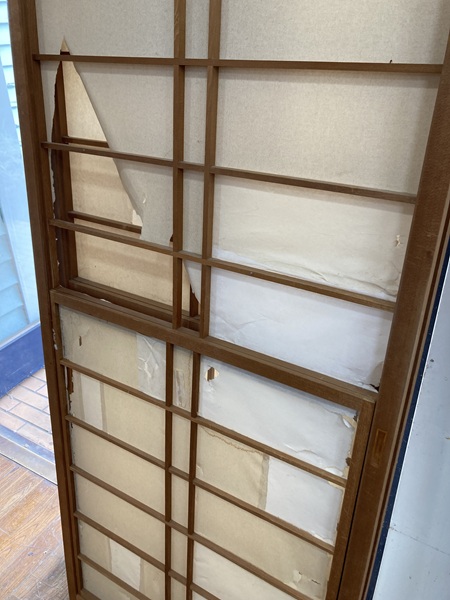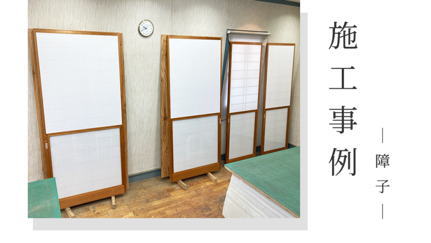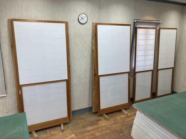 施工は、古い紙の剥がしと枠の糊取りから丁寧に行い、紙のテンションを均一に保つために慎重に貼り進めました。水平・垂直のラインを整え、見た目の美しさにも配慮しながら仕上げています。