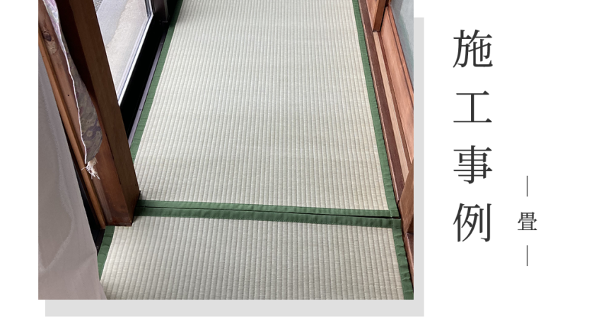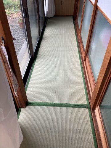 強い日差しが差し込む古民家の廊下に、い草の自然な緑がよく映え、写真でもわかるほど明るく清潔感のある空間に。