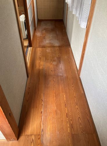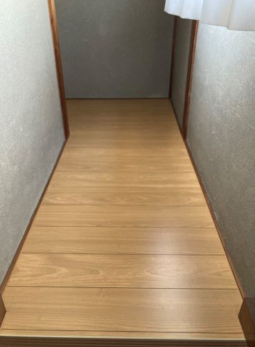施工後は、通路を歩いた際の沈み込みやきしみ音がなくなり、しっかりと安定感のある床に生まれ変わりました。