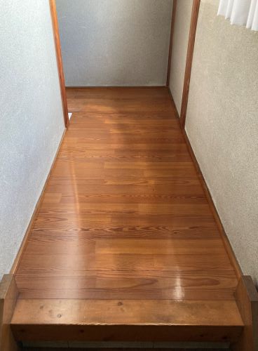 明るいフローリングによって、2階通路全体が以前よりも明るく、清潔感のある印象になっています。