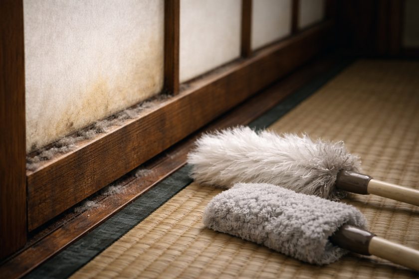 はたきやハンディモップは、桟の表面や隅に溜まったホコリを落とすのに適しています。